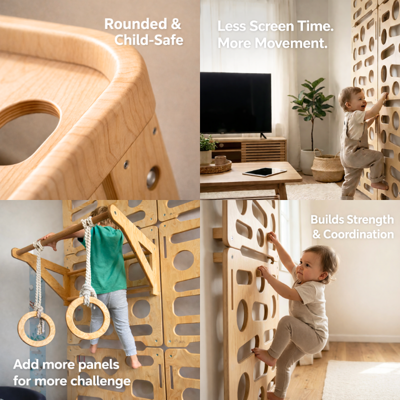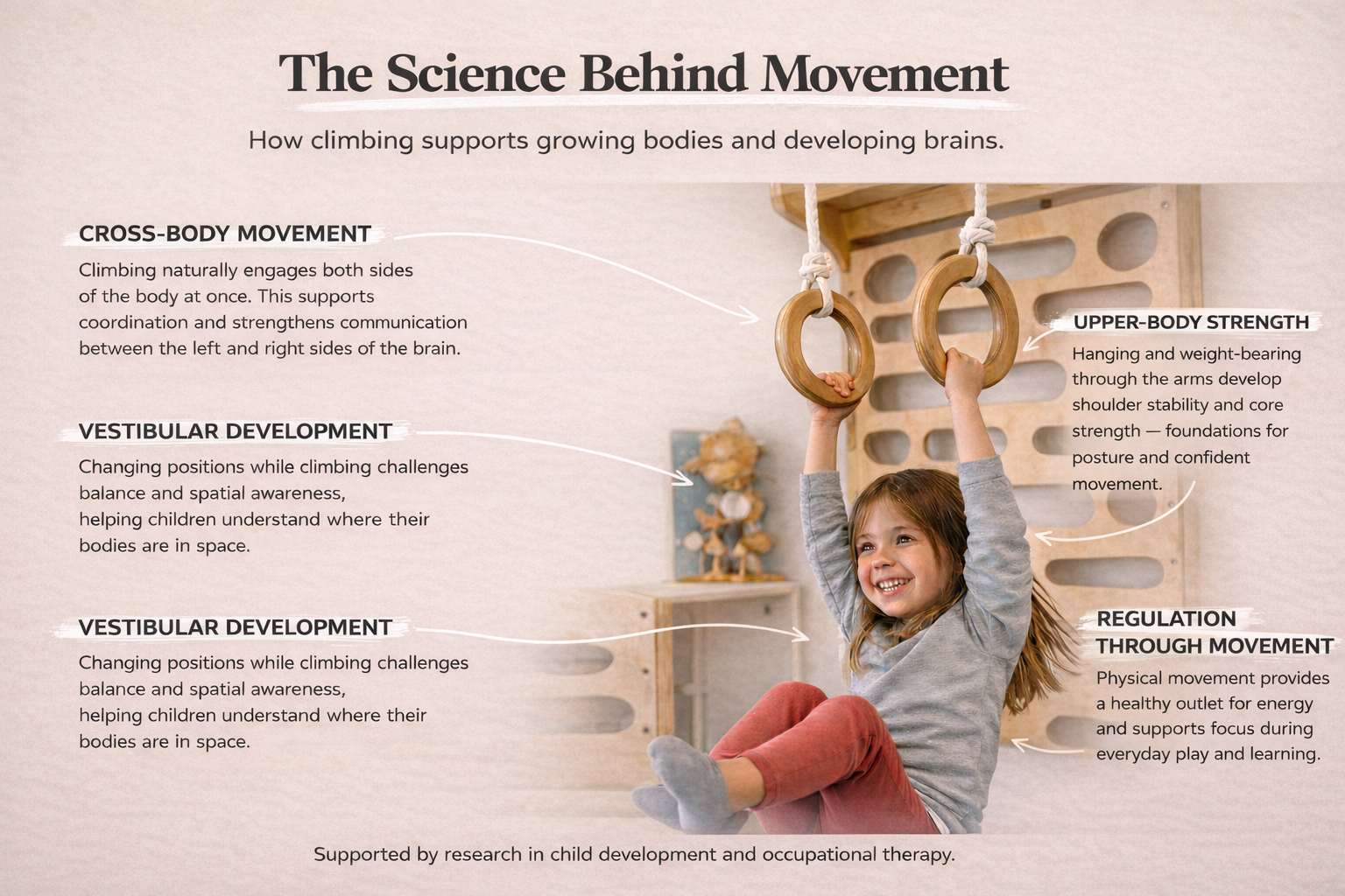 Climbing, hanging, and reaching develop core strength and steady balance through daily use.